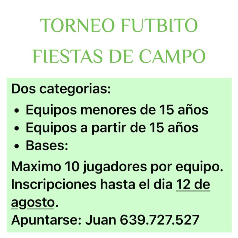 ??Torneo de futbito Whatsapp: ??Torneo de futbito Fecha 29 julio 2024 Fiestas de Campo: ??Torneo de futbito: equipos menores de 15 años y equipos a partir de 15 años con un máximo de 10 jugadores por equipo. Interesados apuntarse antes del 12 agosto llamando a Juan tlf 639727527 Galería imágenes cat: Deporte, vaobulcary: 3610699 cat: Eventos y fiestas, vaobulcary: 3610699 cat: Deportes, vaobulcary: 3610676 cat: Eventos y fiestas, vaobulcary: 3610676 cat: Cultura, vaobulcary: 3610676 cat: Infancia y juventud, vaobulcary: 3610676
