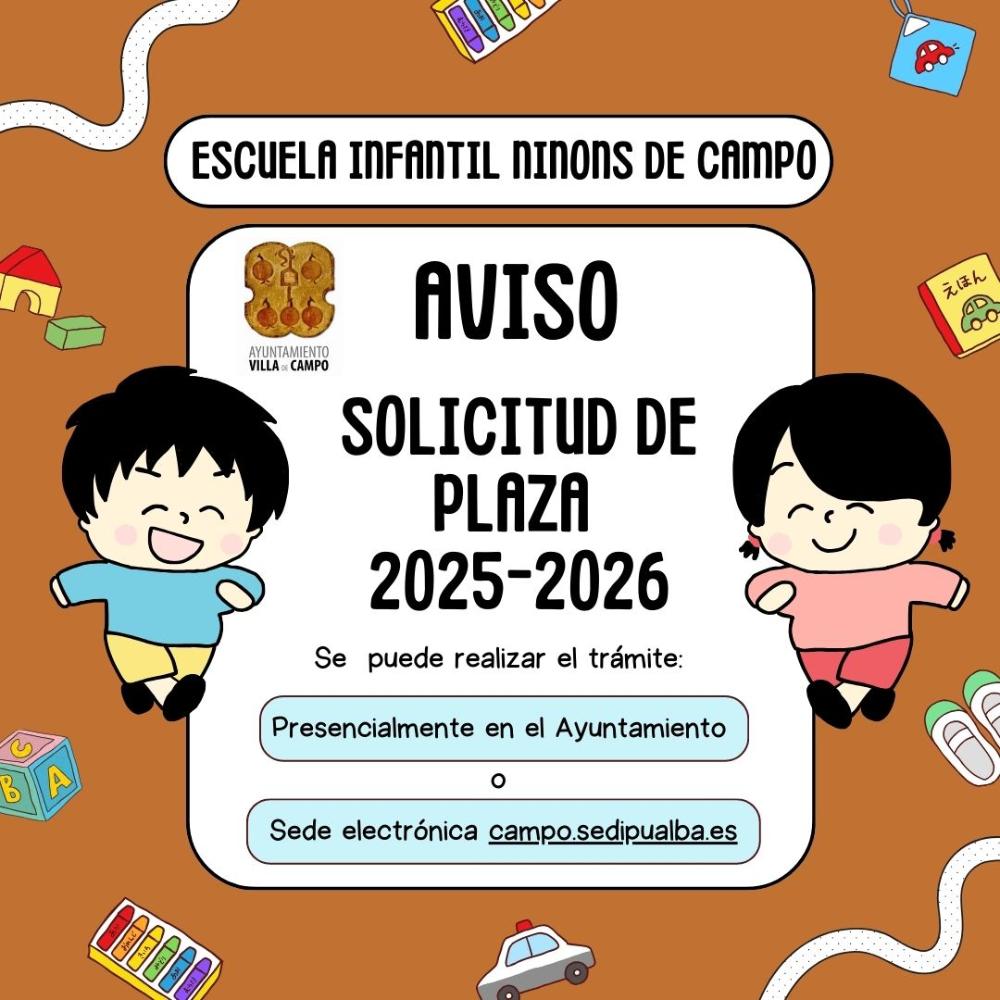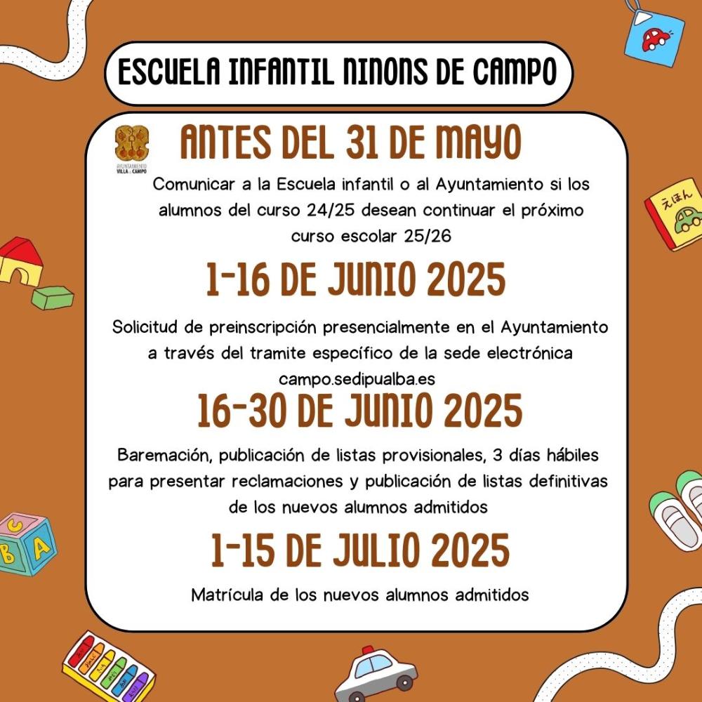 Del 1 de junio hasta el 16 de junio de 2025 es el plazo de preinscripción para los alumnos que quieran formar parte de la Escuela infantil Ninons. La solicitud de plaza se puede realizar presencialmente en el Ayuntamiento o través de del trámite específico de nuestra sede electrónica campo.sedipualba.es