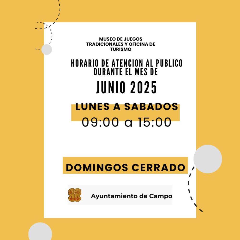 Museo de Juegos Tradicionales y Oficina de Turismo Whatsapp: Museo de Juegos Tradicionales y Oficina de Turismo Fecha 12 junio 2025 Durante el mes de junio puedes visitar el Museo de Juegos Tradicionales e informarte en la Oficina de Turismo en el siguiente horario: - Lunes a Sábado de 9h-15h Acércate y conoce las opciones turísticas que te ofrece Campo Galería imágenes cat: Ayuntamiento, vaobulcary: 3610699 cat: Cultura, vaobulcary: 3610699 cat: Municipio, vaobulcary: 3610699 cat: Participación ciudadana, vaobulcary: 3610699