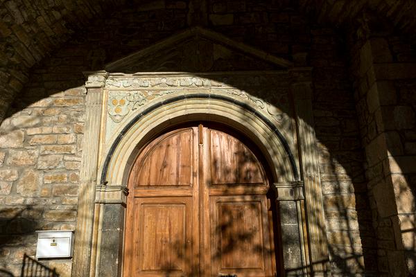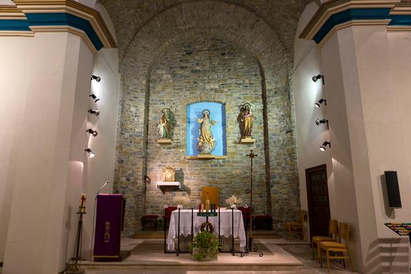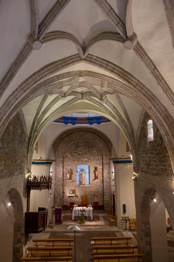 En uno de sus muros interiores, en la zona del coro, hay incrustado un crismón románico procedente de otro edificio. Mención especial merecen los colores que encontramos en el interior.